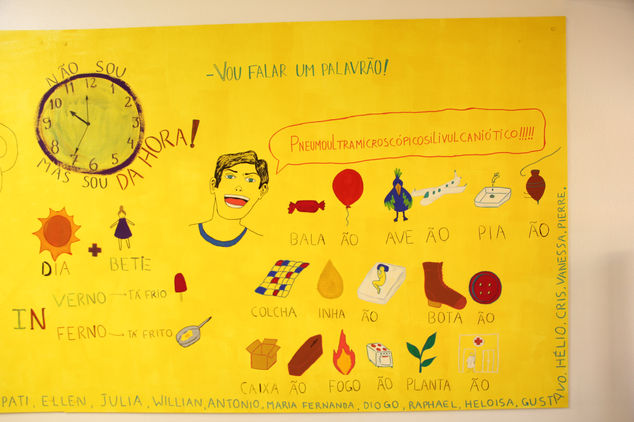 Mural built together with the SESC’s passers-by, who brought their repertoire of words that play with the Portuguese, French and Spanish language.